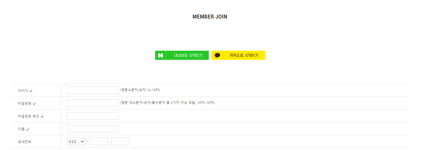 카페24 관리자페이지에서 [설정 > 고객설정 > SNS로그인 연동 관리] 페이지에서 각종 로그인 관련 설정을 하고 나면 로그인화면에서 자동으로 SNS 로그인 버튼들이 뜬다. 그런데 회원가입페이지에서는 SNS로그인 버튼이 안보이는 상황이!