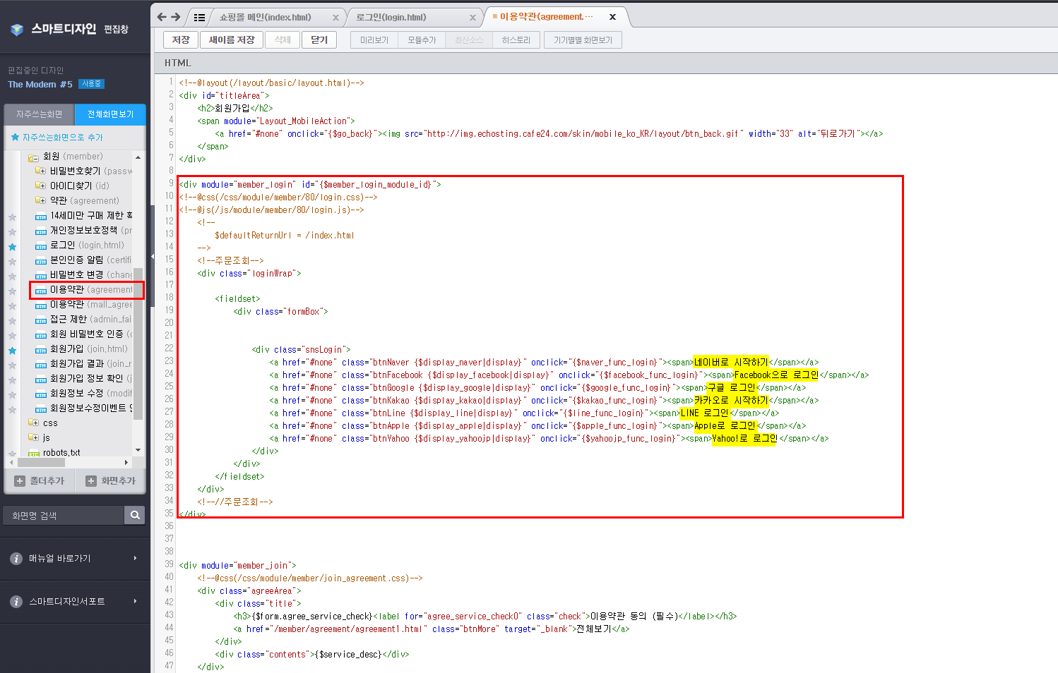 2) 이용약관(agreement.html) 파일을 열고 복사한 코드를 붙여넣기 한 뒤, SNS로그인 관련 부분을 제외하고는 모두 삭제한다. 그리고 '~(으)로 로그인'이라고 되어있는 텍스트를 '~(으)로 시작하기'로 변경해주면 끝!