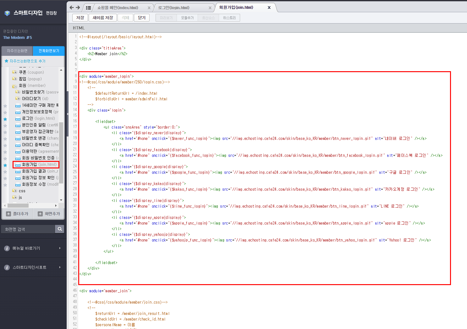 4) 회원가입(join.html) 페이지를 열고 상단에 복사한 코드를 넣는데, SNS로그인 영역을 제외한 불필요한 영역은 삭제한다.