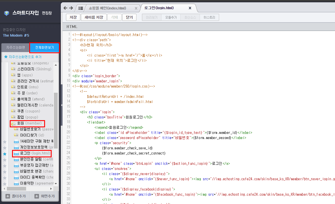 2) 왼쪽 영역에서 [전체화면보기] 클릭 후, 회원(member) 폴더를 찾은 뒤, 그 안의 로그인(login.html)파일을 연다.