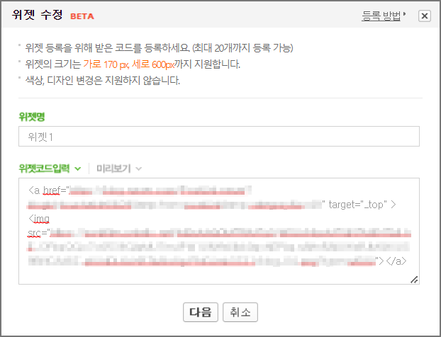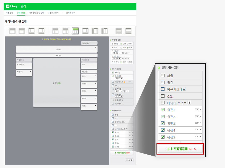 네이버 블로그는 레이아웃·위젯 설정 페이지에서 자유롭게 위젯 추가가 가능하다. 위젯을 통해 블로그 스킨 내에 원하는 이미지를 넣거나 링크 연결이 가능하다.
