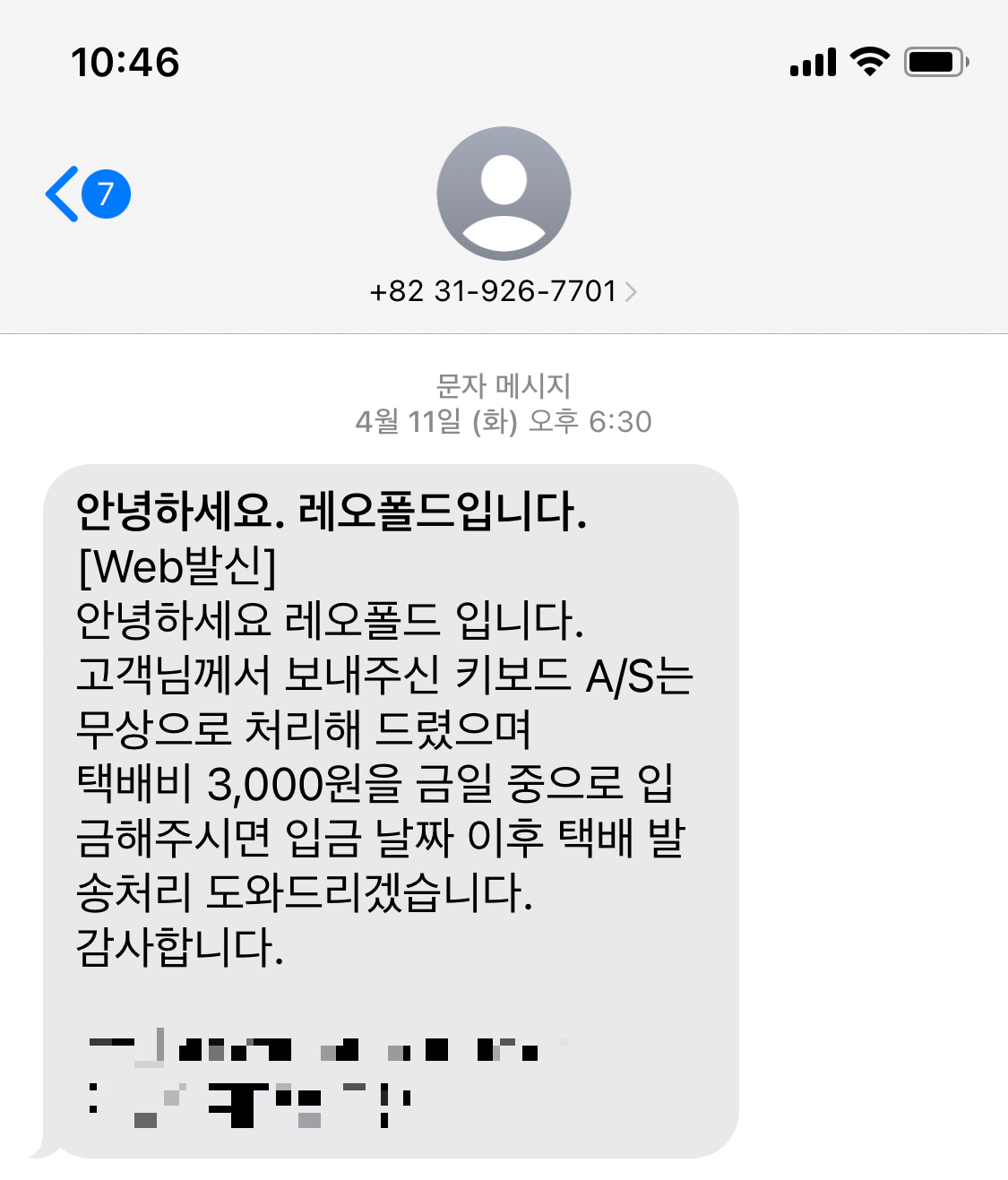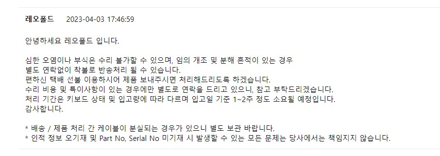 그러면 이런 안내 답변을 받게 되는데, 받은 후, 키보드를 택배로 보내면 된다.