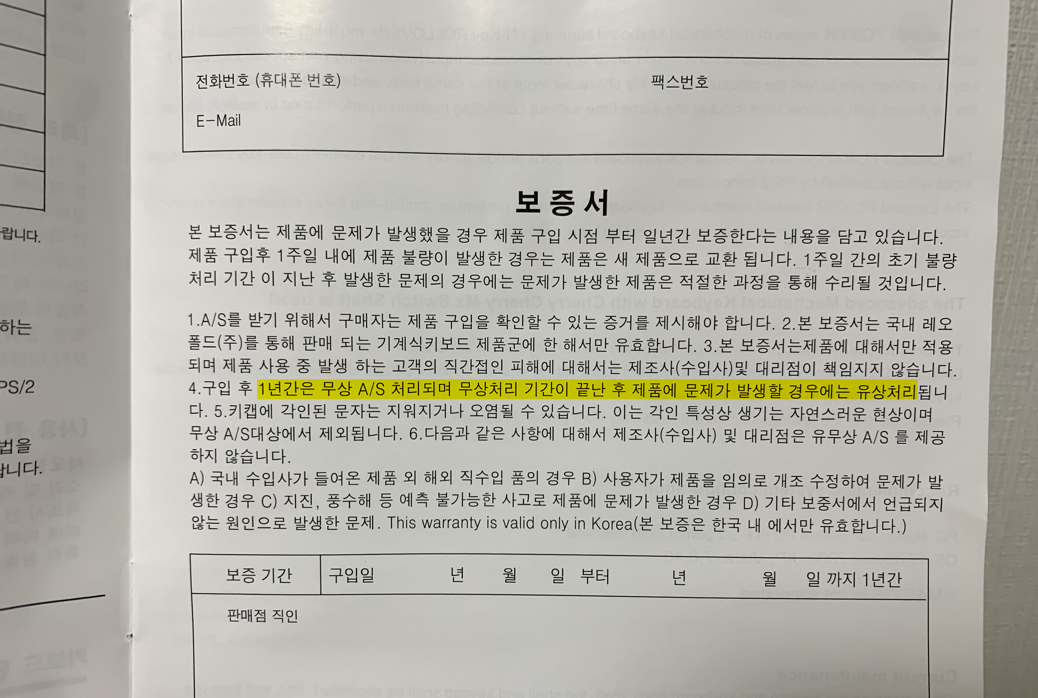 보증서에는 구입 후, 1년간 무상 A/S처리되고, 기간이 끝난 후 제품에 문제가 발생할 경우 유상처리 된다고 되어있었다. 그리고 레오폴드 홈페이지를 확인하니 키를 교체하는 것 자체는 크게 비용이 들지 않아서 일단 A/S접수를 해보기로 하였다.
