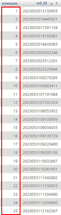 나의 경우에는 해당 날짜의 주문건을 불러와 주문번호 순서대로 1부터 차례대로 번호를 매기는 작업이 필요하여 아래와 같이 쿼리문을 작성하였다.
