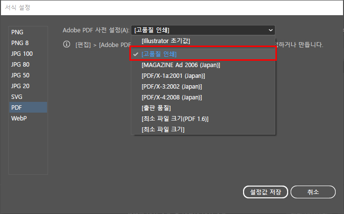 2) PDF를 선택 후, Adobe PDF 사전설정을 [고품질 인쇄]로 선택한다. 설정값 저장 후, PDF 내보내기하면 끝!