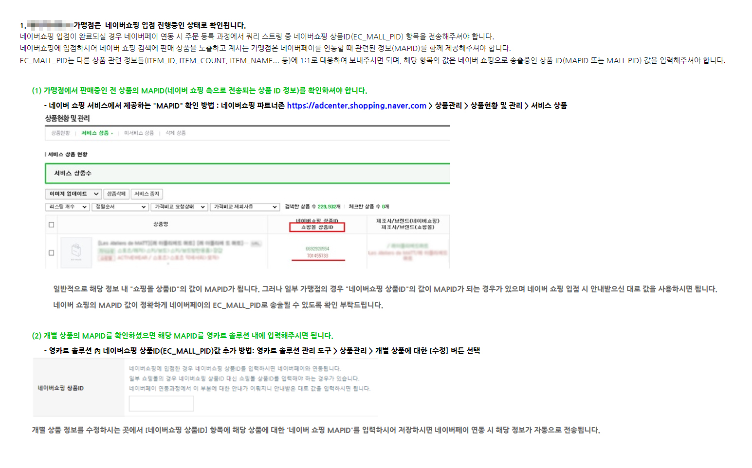 네이버쇼핑 입점이 완료되실 경우 네이버페이 연동 시 주문 등록 과정에서 쿼리 스트링 중 네이버쇼핑 상품ID(EC_MALL_PID) 항목을 전송해주셔야 합니다.