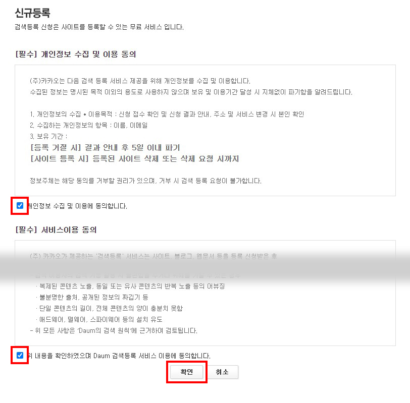 2. 개인정보 및 서비스 이용 동의에 체크 후 [확인]을 누른다.