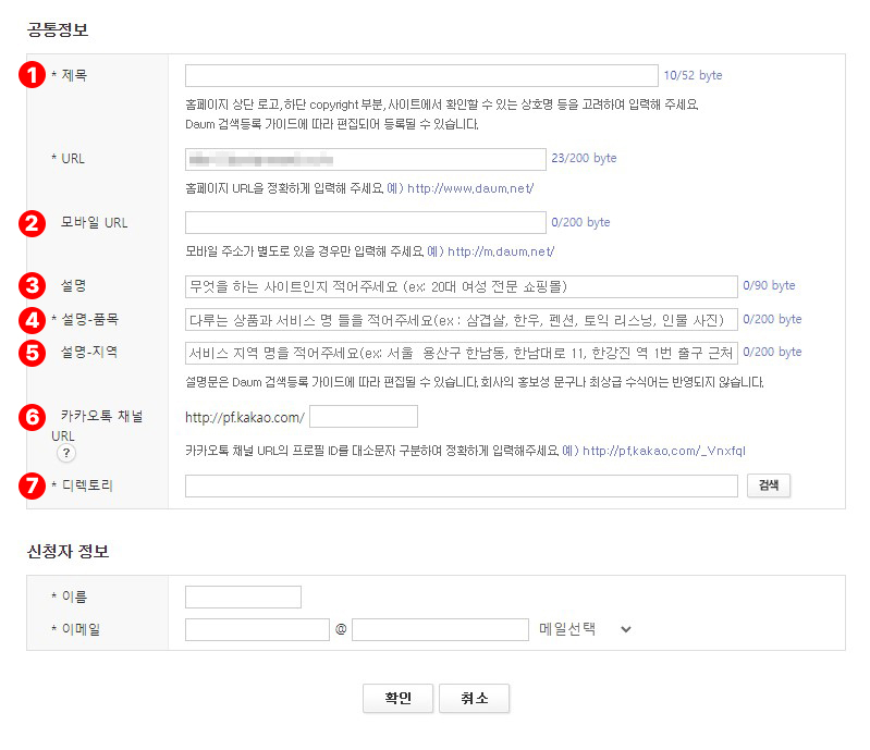 7) 디렉토리 (필수) : 사이트가 해당하는 디렉토리를 검색해서 적어준다.