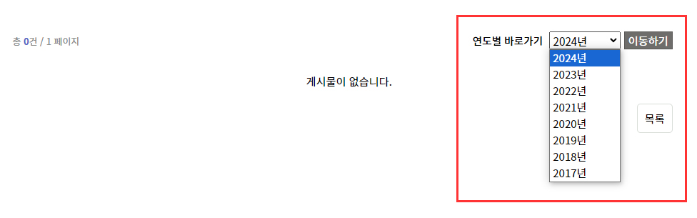 기본적으로 현재 연도에 해당하는 게시물만 보여지며, 게시판 우측 상단에서 연도를 선택한 뒤 '이동하기'를 클릭하면 해당 년도에 속하는 게시물만 볼 수 있도록 하는 기능이다.