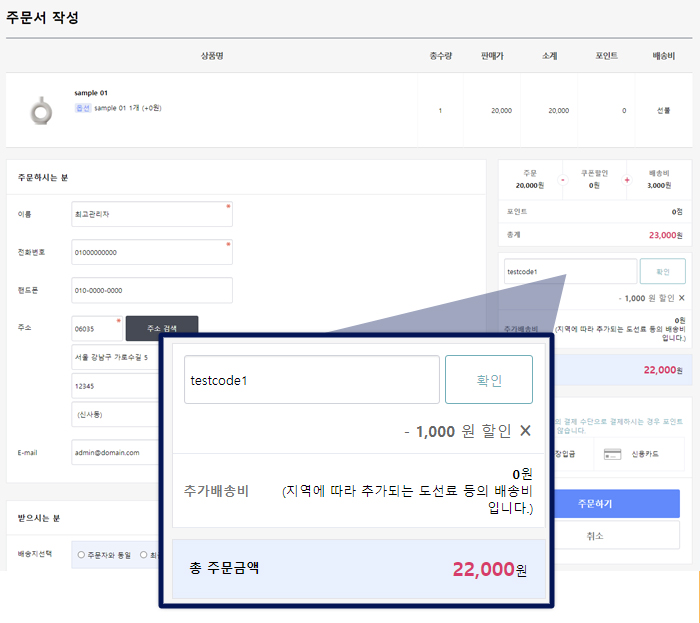 회원이 상품 주문시 해당 할인코드를 입력하면 관리자가 설정한 할인금액만큼 주문총액에서 할인되도록 하는 기능입니다.
