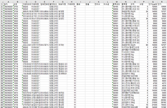 거래처코드/거래처명/업체전화번호/출하창고/대표자명/거래유형/품목코드 등