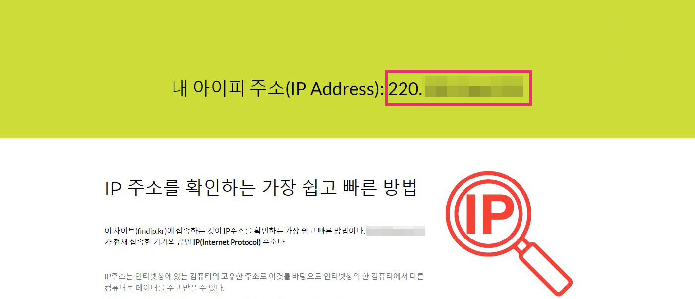 내 아이피 주소는 https://www.findip.kr/ 사이트에서 바로 확인이 가능합니다.