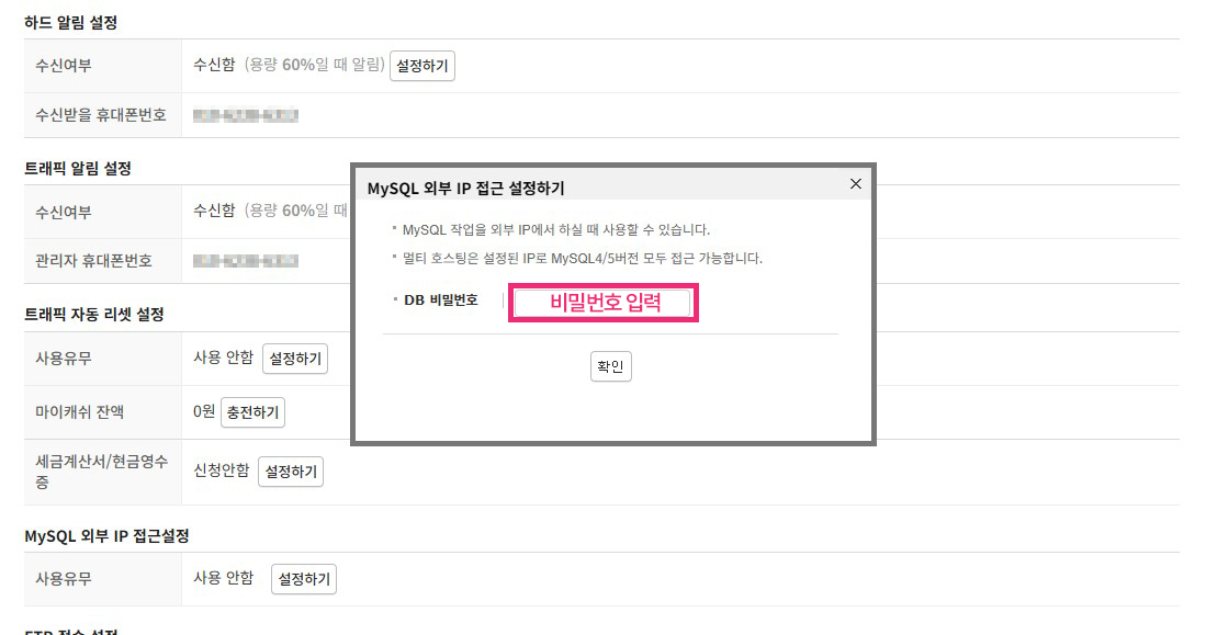 2. 서비스사용현황 첫 페이지 아래쪽의 MySQL 외부 IP접근설정 항목이 있는데, 여기서 [설정하기] 버튼을 클릭합니다.