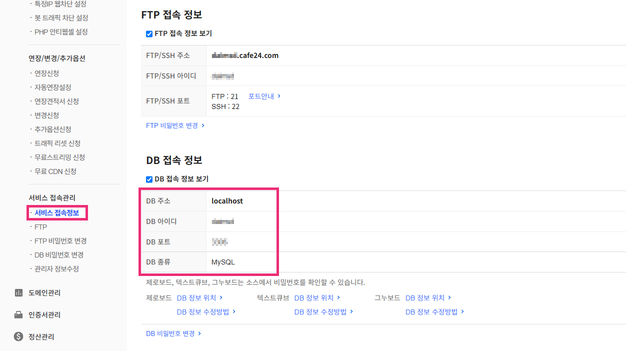 5. 아이피 설정을 완료하면 좌측 메뉴에서 '서비스 접속정보'를 클릭합니다. 그러면 아래쪽에 DB 접속 정보가 보입니다.