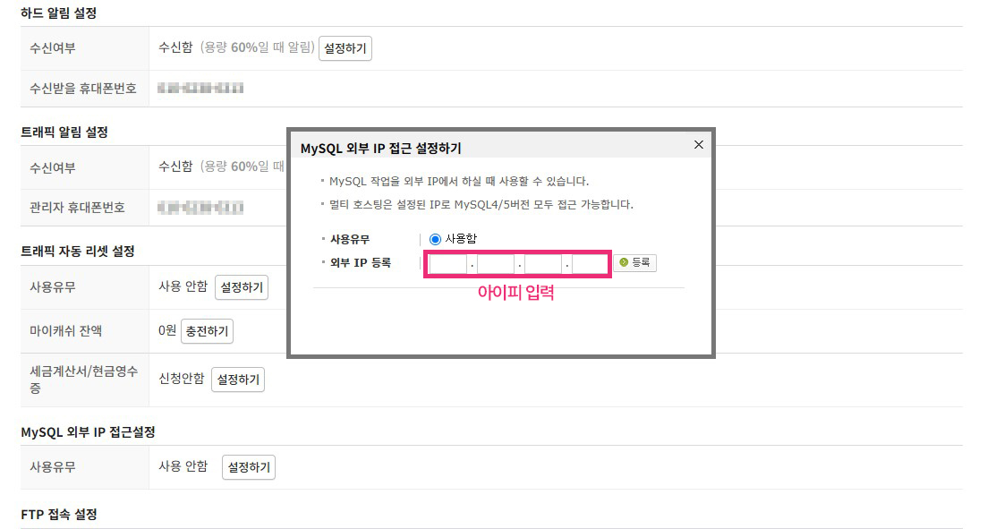- 카페24는 보안 상 외부 IP 허용 설정이 필수이니, 고정 IP를 사용하는 것이 좋습니다.