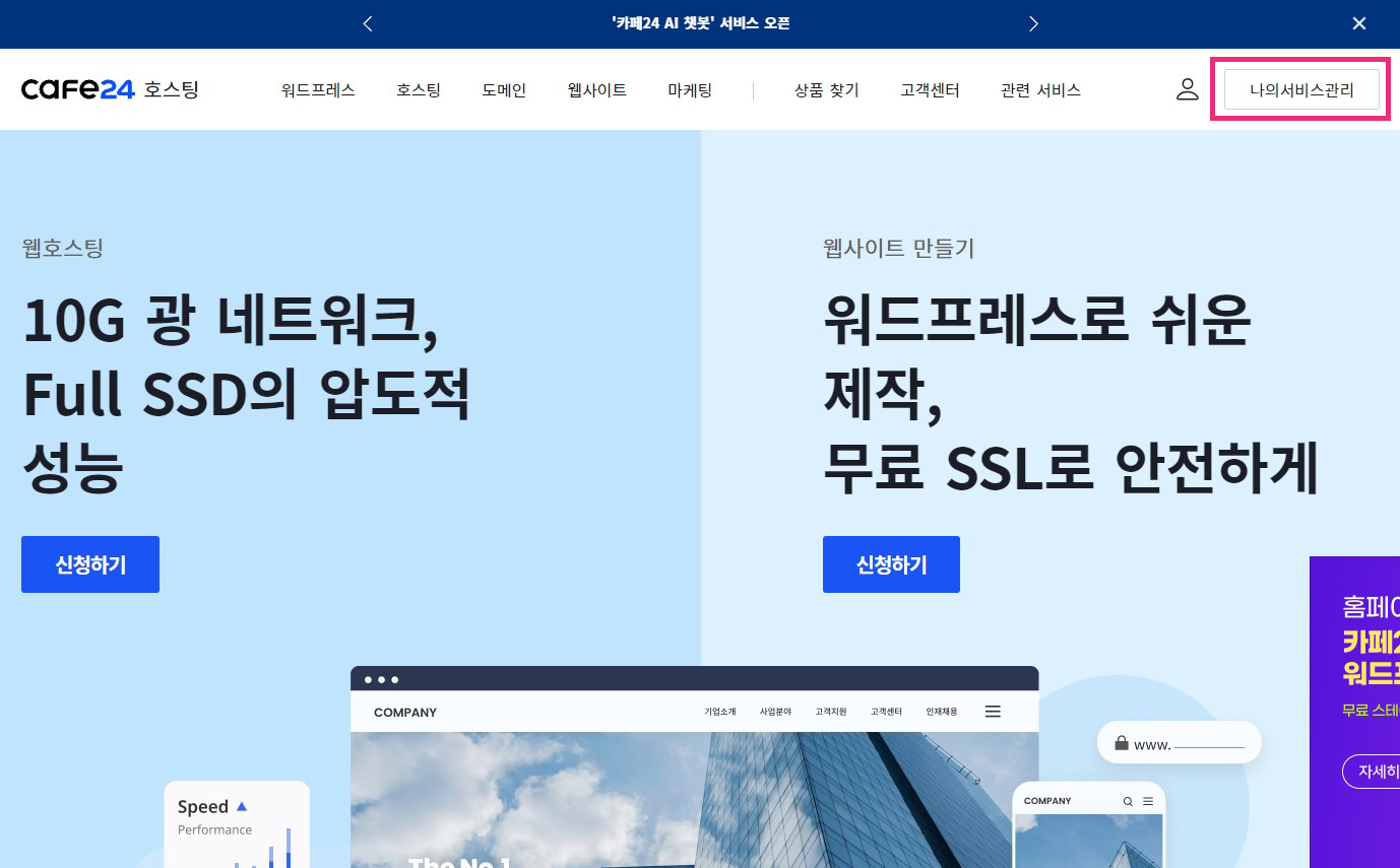1. 카페24 홈페이지 로그인 후, 우측 상단 [나의서비스관리]를 클릭.