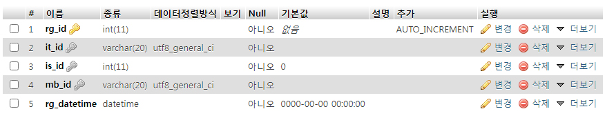 $sql = " select rg_id as count from 테이블명 where it_id = '{$it_id}' and is_id = '{$is_id}' and mb_id = '{$mb_id}' ";