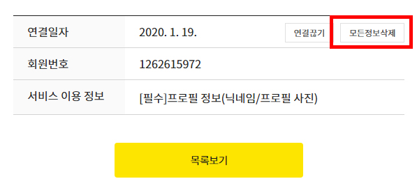 4. 이력 삭제를 원하는 서비스 이름을 클릭한 뒤, [모든정보삭제]를 누르면 카카오톡 로그인 기록이 모두 삭제 된다.