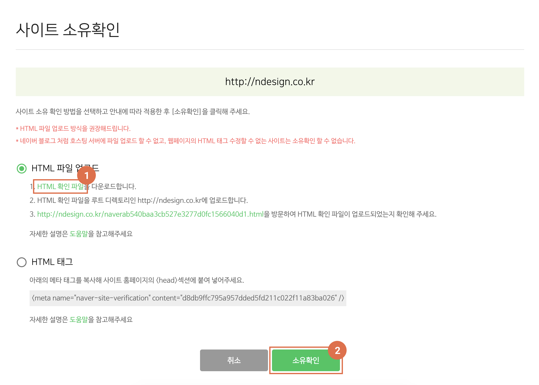 둘중 하나의 방법을 한 뒤, [소유확인] 버튼 누르면 일단 등록 완료!