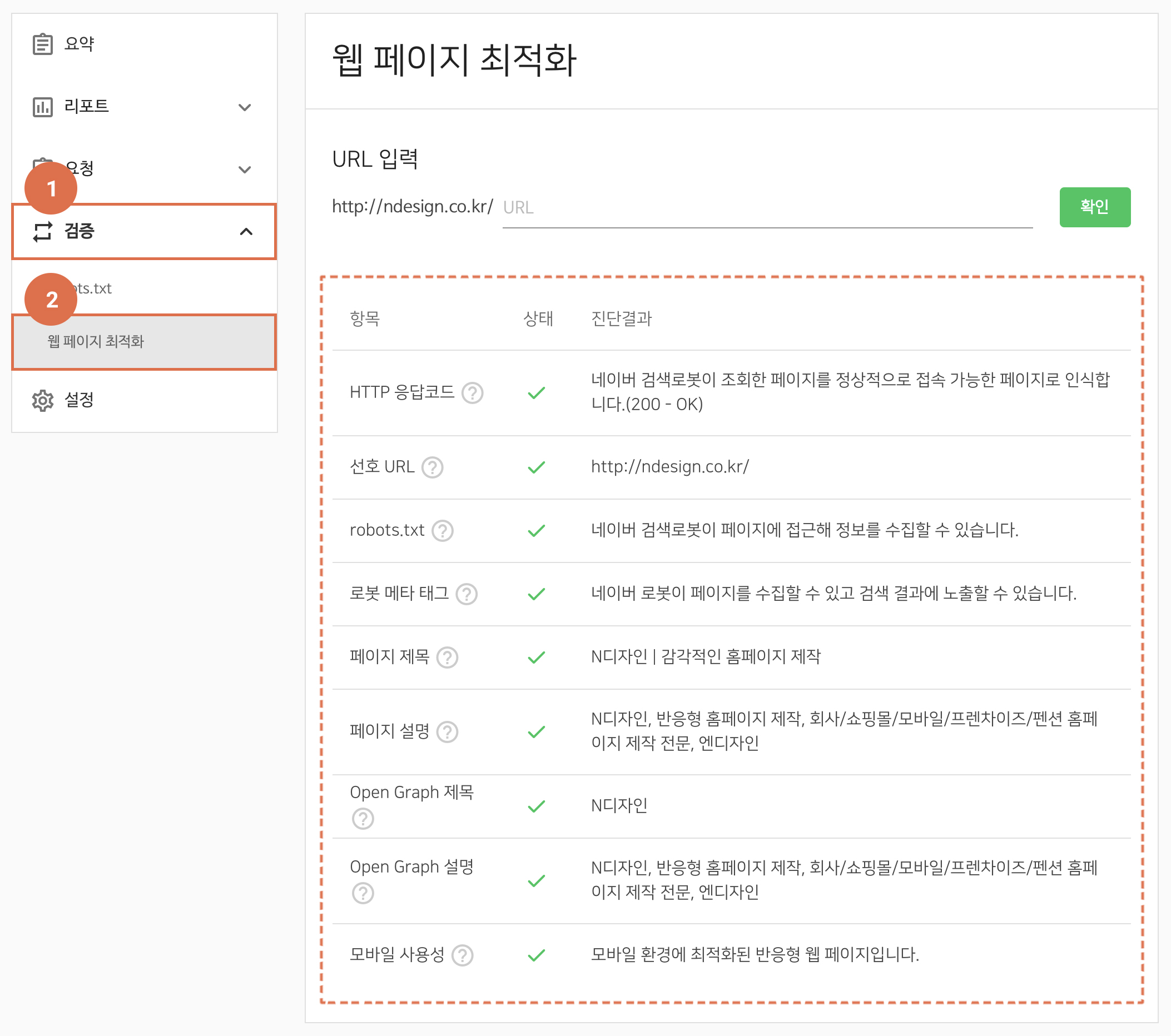 웹마스터 도구 메뉴에서 [검증] > [웹페이지 최적화]를 클릭해 충족되지 않은 항목이 있는지 체크한다. 해당되지 않는 항목이 있다면 수정해주고 다시 점검해 보아야 한다.