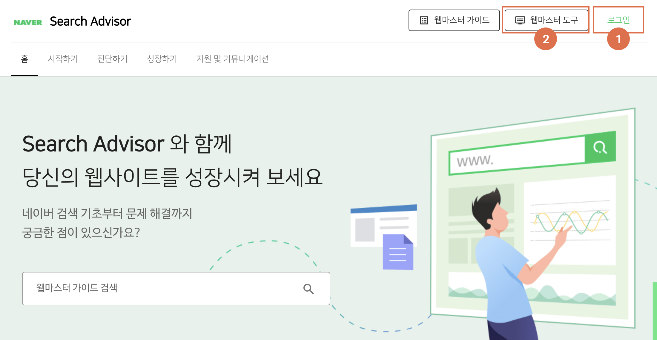 상단의 [로그인] 버튼을 눌러 로그인 한 후, [웹마스터 도구]를 클릭한다.