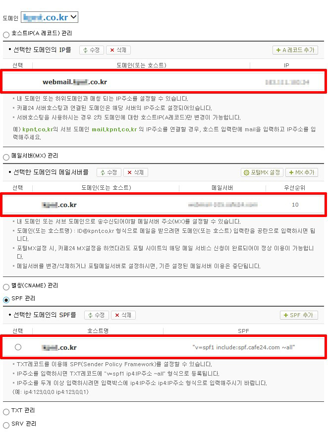이용하는 서비스 홈페이지의 도메인 DNS 설정에 들어가 메일 서버의 A레코드, MX값, SPF값을 넣어준다.