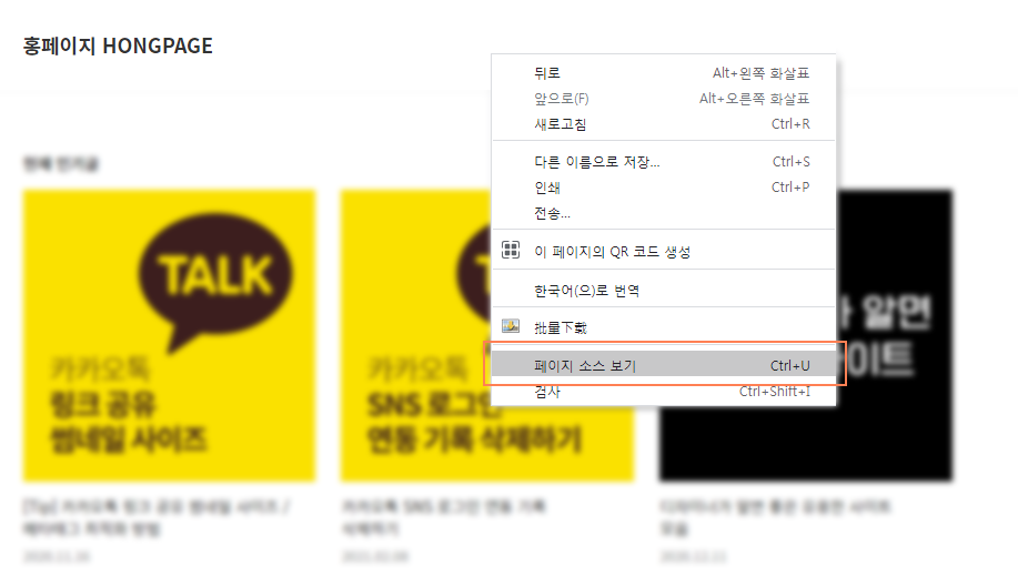 2. 내 티스토리 블로그 빈 화면 아무데나 데고 오른쪽 마우스를 클릭해 [페이지 소스보기]를 클릭한다.