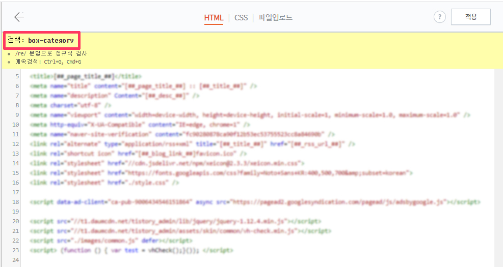 2. 그러면 HTML 코드들이 나오는데 Ctrl + F 를 눌러 box-category를 검색해줍니다.