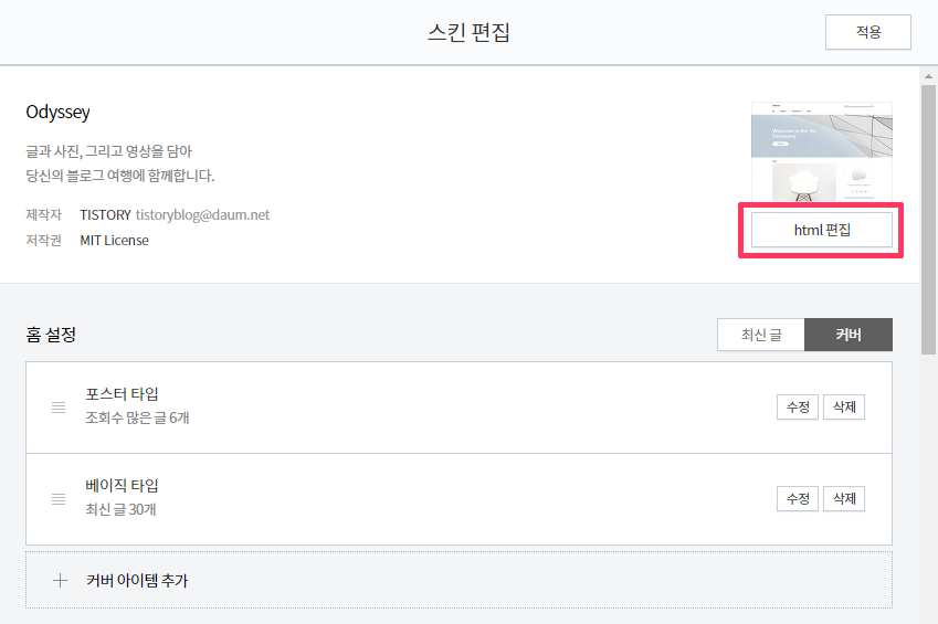 1. 꾸미기 > 스킨편집을 클릭해 [html 편집]을 클릭합니다.