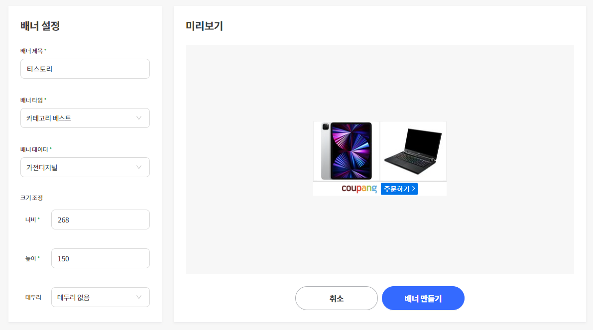 3. 쿠팡파트너스 홈페이지에서 배너를 생성해주세요.