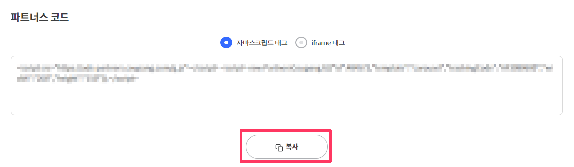 단순 상품링크, 다이나믹배너 등 종류는 상관 없습니다. 제공하는 코드를 복사합니다.