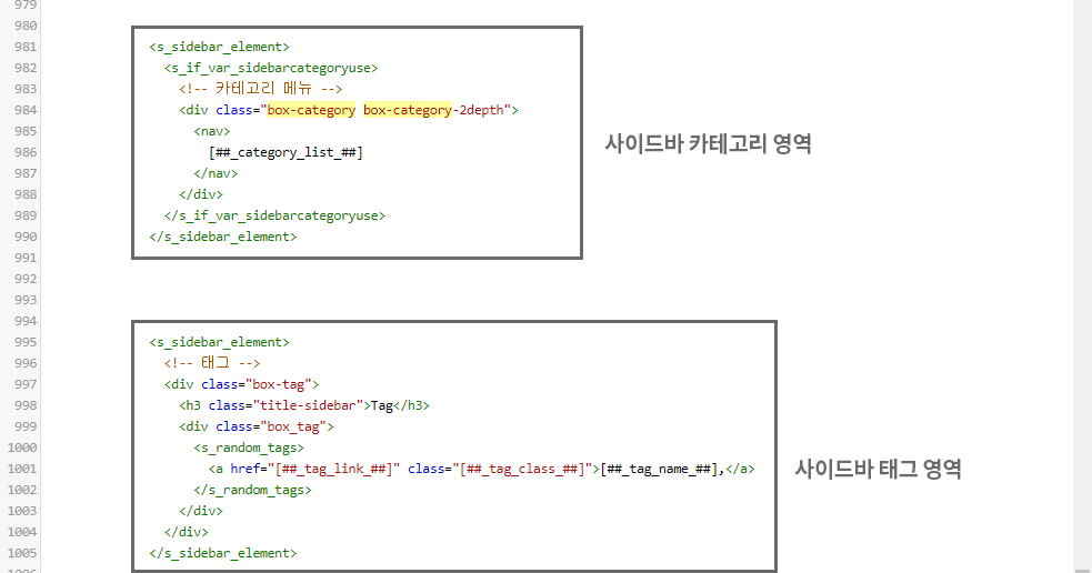 사이드바의 각각의 영역은 <s_sidebar_element> 와 </s_sidebar_element>로 감싸져 있는 것을 확인하실 수 있습니다.