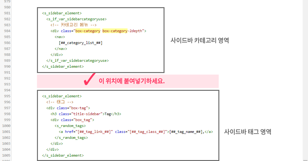 4. 다시 티스토리 스킨편집창으로 돌아과 카테고리 영역과 사이드바 영역 사이에 복사한 코드를 붙여넣기 합니다.