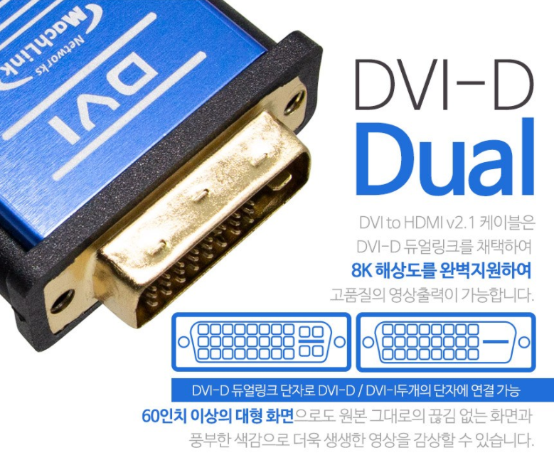 DVI도 종류가 여러개라고 하길래 쿠팡에 나와있는 상세설명을 꼼꼼하게 읽어본뒤, 구입하게 된 젠더. 마하링크 Ultra DVI TO HDMI ver2.1 8K 케이블 1.2m