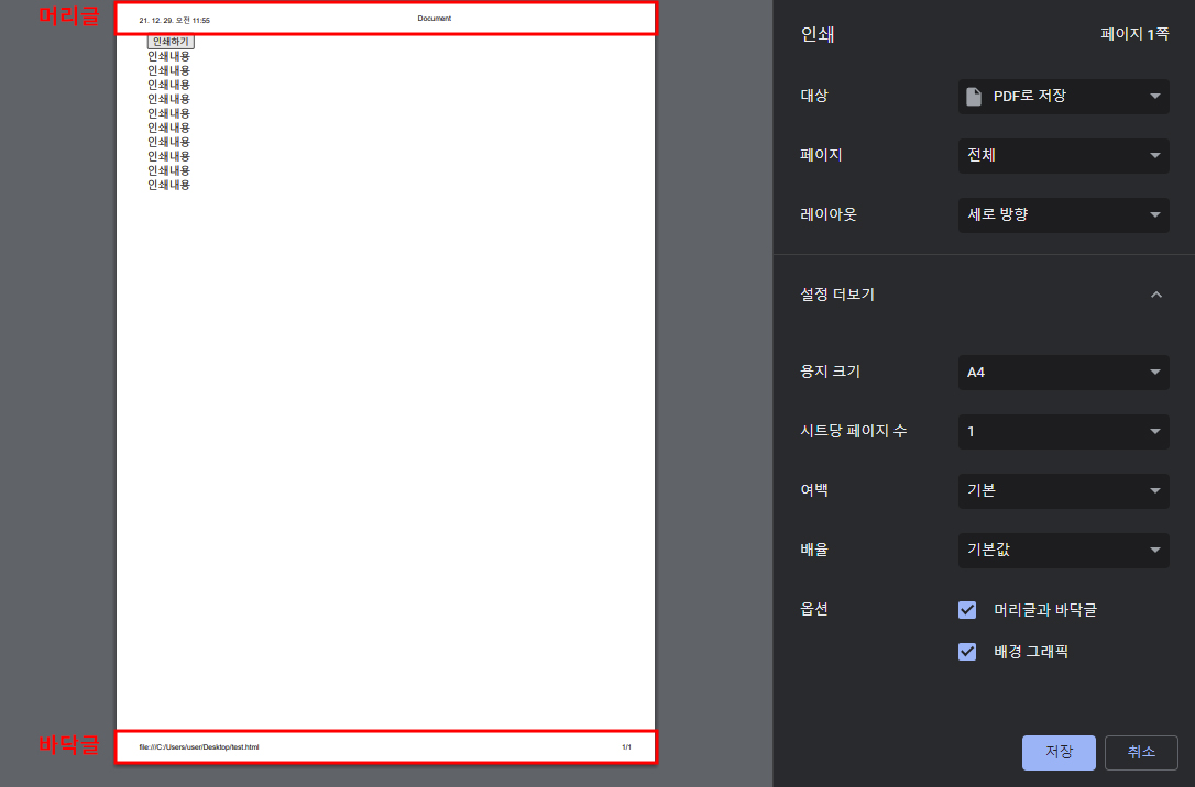 하지만 이 인쇄창에는 머리글, 바닥글이 기본적으로 나오게되고 불필요한 정보들을 담고 있다.