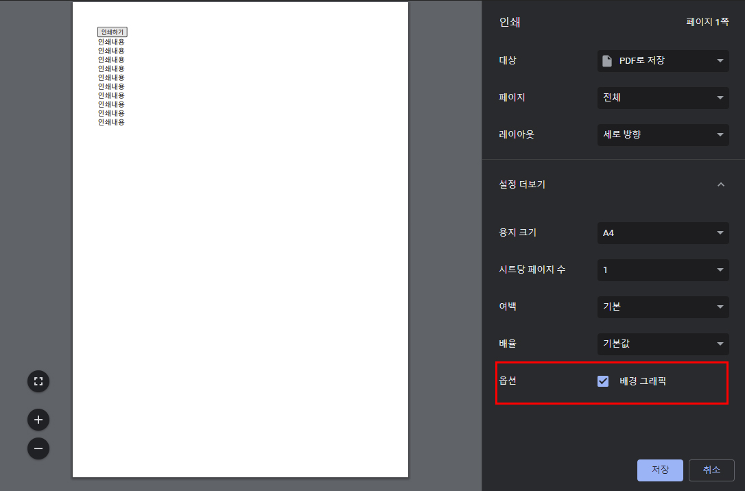 인쇄페이지의 머리글과 바닥글도 깔끔하게 없어지고, 인쇄 옵션 부분에서도 '머리글과 바닥글' 선택 옵션이 아예 사라졌다.