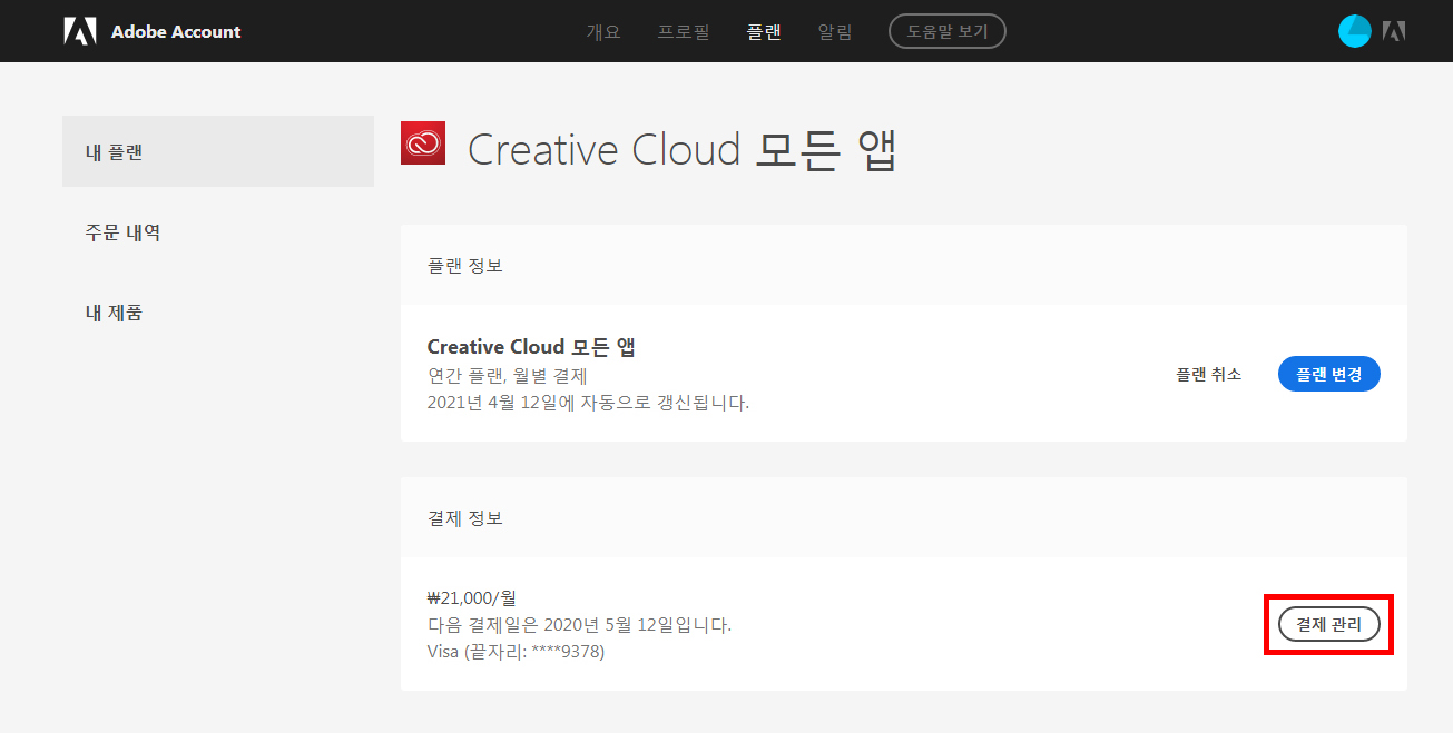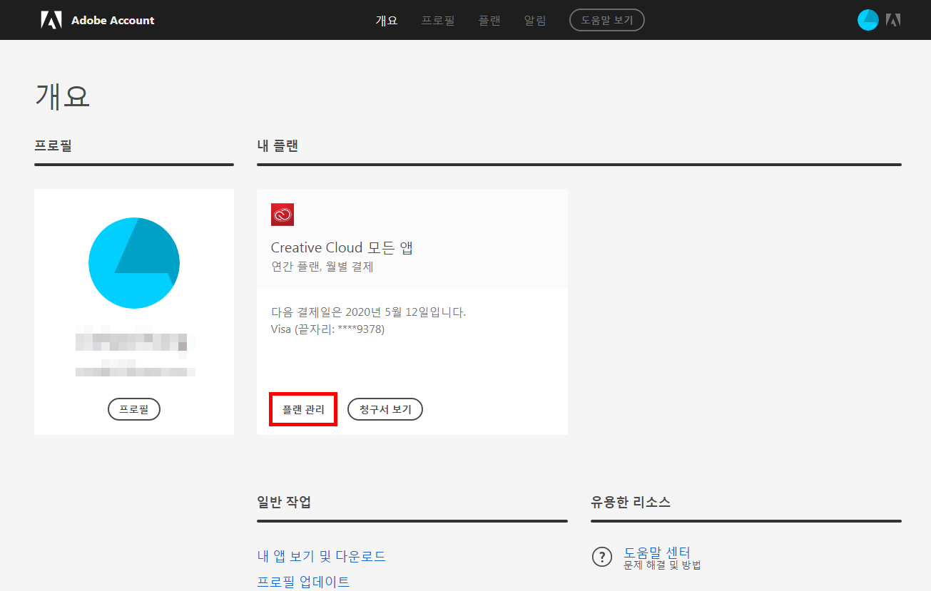 1. 어도비 어카운트 페이지(https://account.adobe.com) 접속 후 로그인.