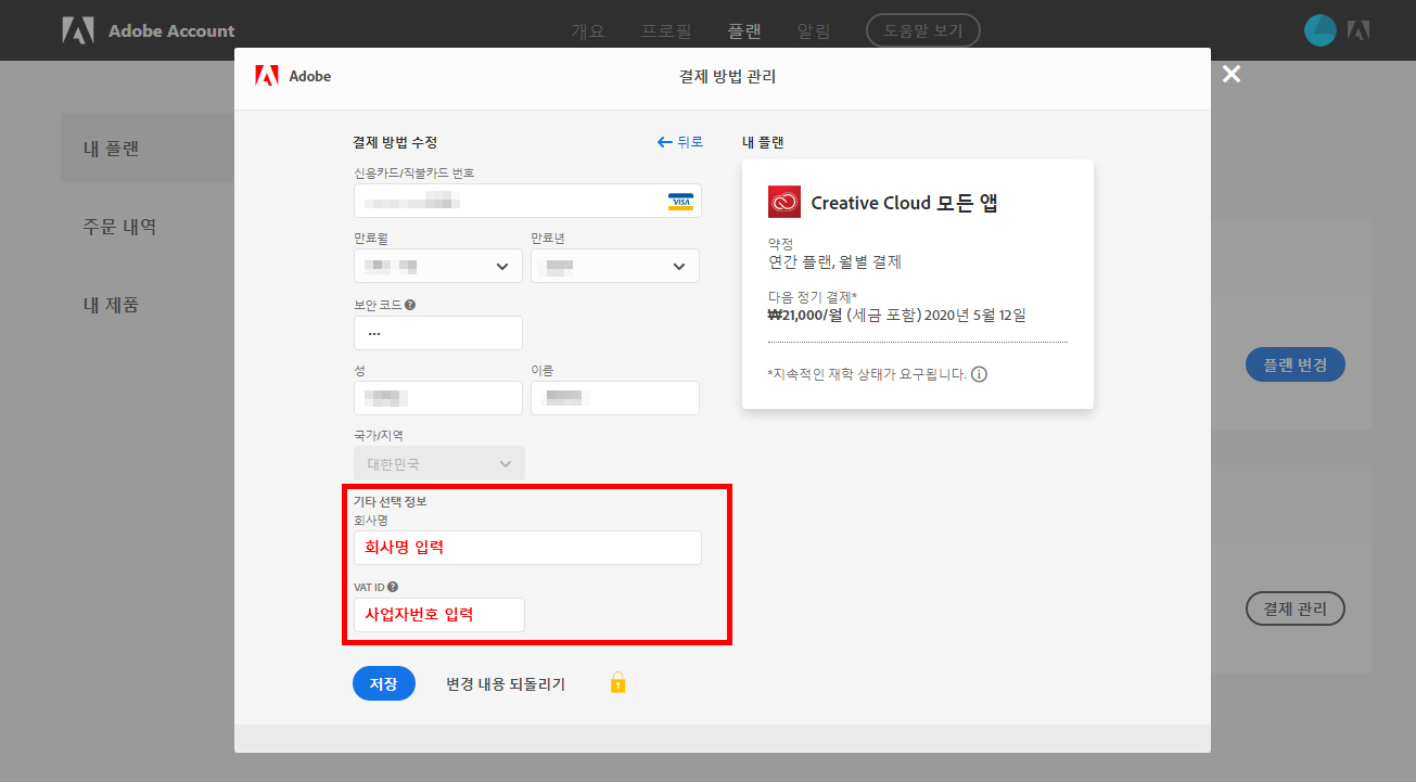 고정적으로 나가는 지출 중에 하나가 Adobe 프로그램 사용료인데 사업자라면 면세를 받을 수 있다.