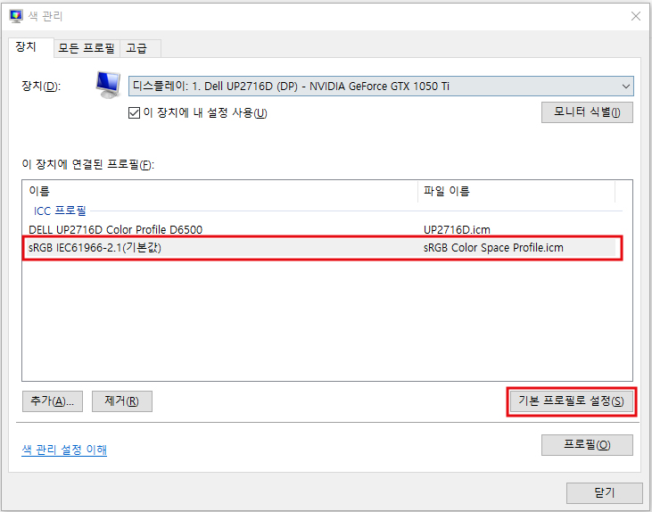 4. 고급탭에서 장치프로필이 시스템 기본값(sRGB IEC61966-2.1)으로 설정되어있는지 확인한 후 닫기를 클릭한다.