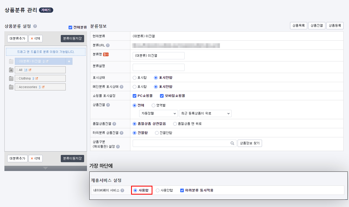 [상품 > 분류관리 > 상품 분류 관리]에 접속하여 분류별로 가장 하단의 네이버페이 서비스 '사용함'으로 되어있는지 확인한다. 사용안함으로 되어있다면 것은 모두 사용함으로 변경해주고, 하위 분류 동시 적용에 체크하면 하위 카테고리까지 모두 적용된다.
