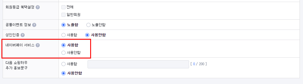 위의 과정까지는 보통 디폴트 값으로 '사용함'으로 되어 있는데, 상품별로는 디폴트값이 네이버페이 서비스 '사용안함'에 되어있어서 나오지 않는 경우가 많으니 꼭 확인해 보아야한다.