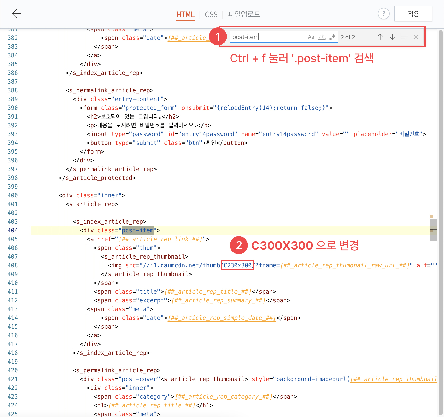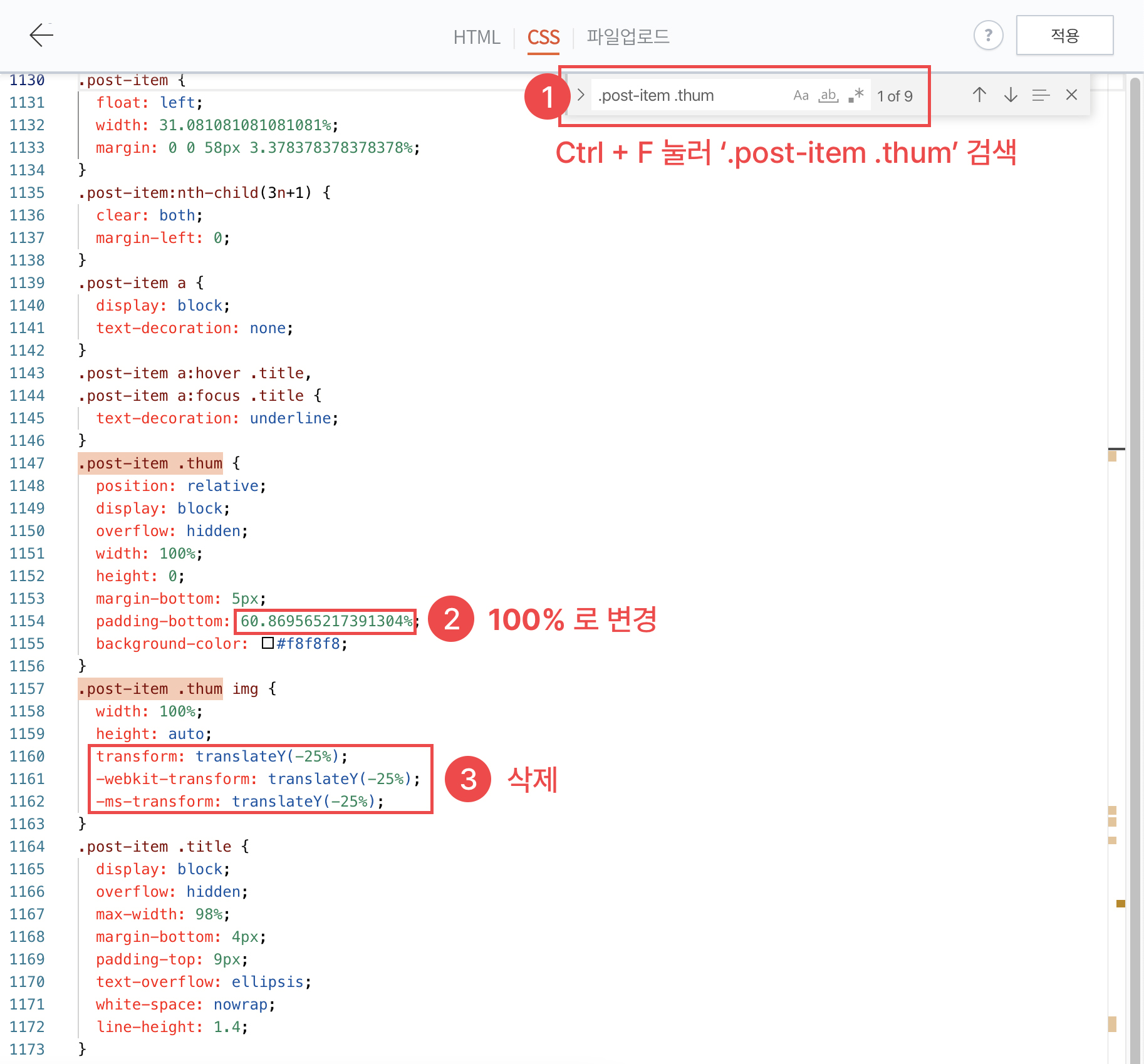 1) CSS 영역으로 이동해서 마찬가지로 Ctrl + F를 누른다음 .post-item .thum 을 검색한다.