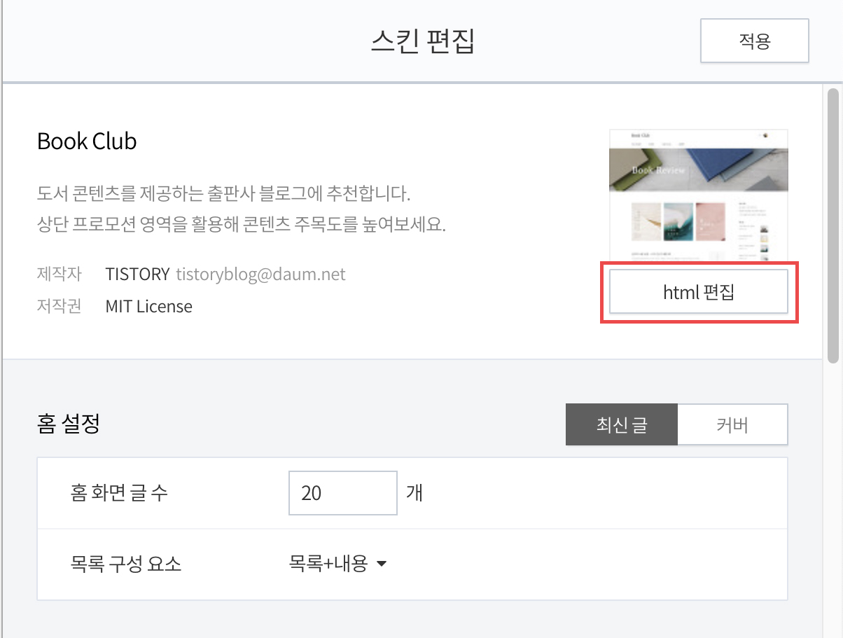이 방법은 북클럽(Book Club) 스킨에만 해당되는 내용이며, 스킨에 따라 수정 방법이 다를 수 있다.