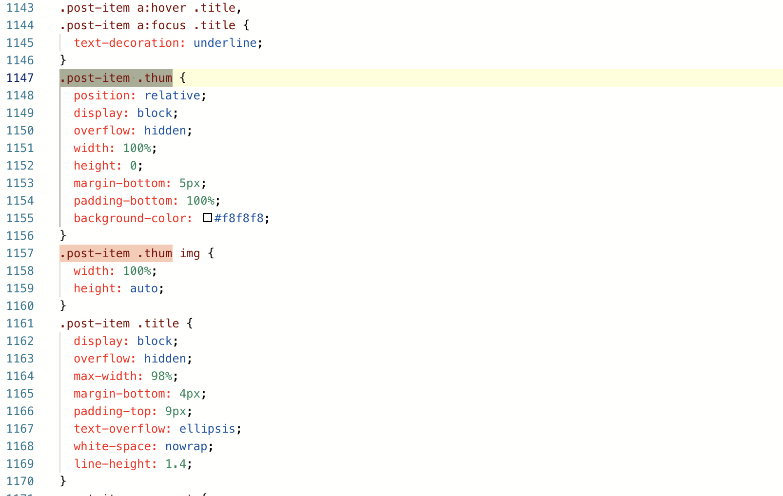 1) CSS 영역으로 이동해서 마찬가지로 Ctrl + F를 누른다음 .post-item .thum 을 검색한다.