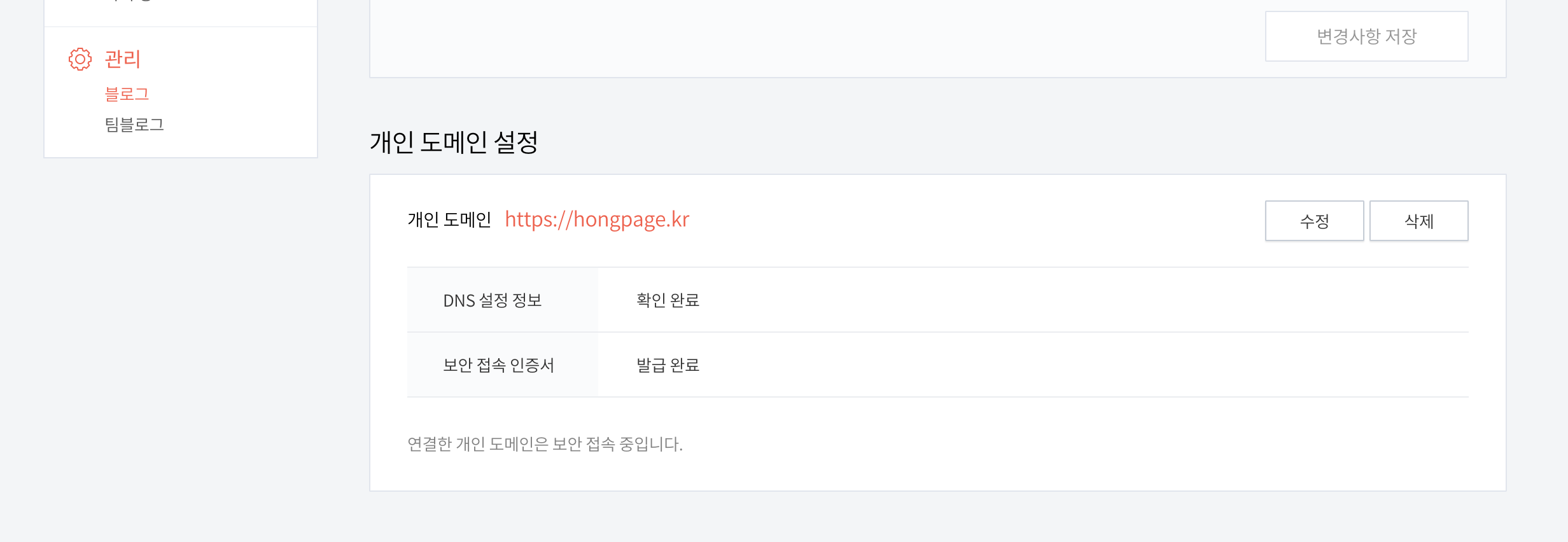 티스토리 기본 도메인이 아닌, 따로 도메인을 구매하였다면 티스토리 관리페이지 [관리 > 블로그 > 개인 도메인 설정 영역]에서 개인 도메인을 설정하게 된다.