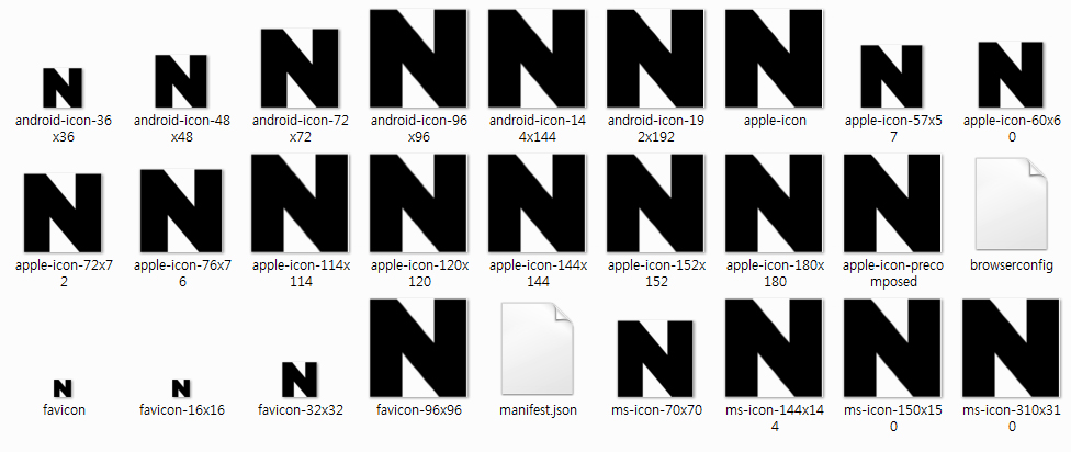 압축 파일을 열어보면 다양한 사이즈의 파비콘 이미지가 제작 되어져있다.