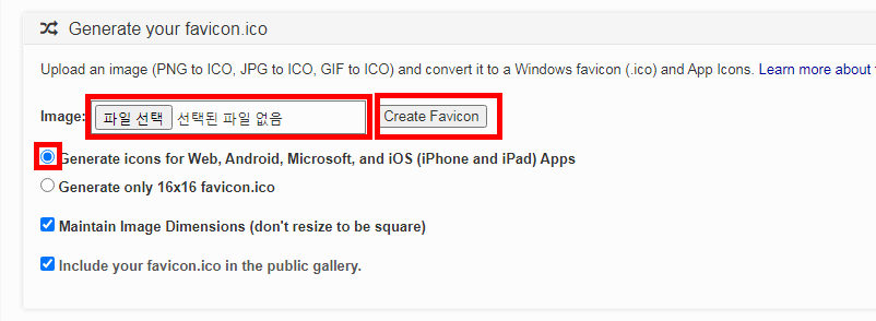 3. 만든 이미지를 첨부하고 [Create Favicon] 버튼을 클릭한다.